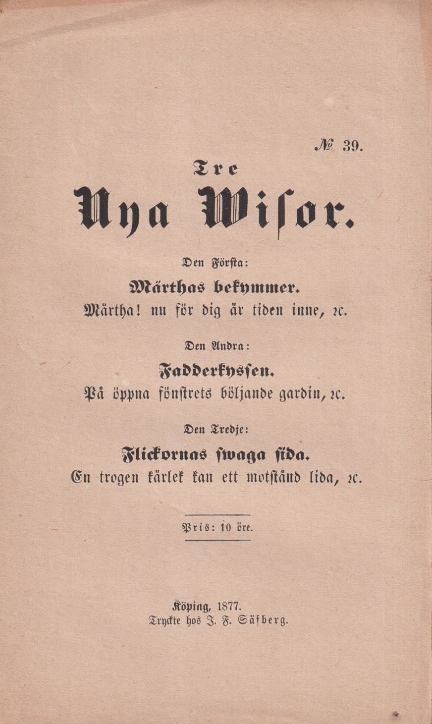Tre nya wisor. Den första: Märthas bekymmer. Märtha! nu för dig är tiden inne, &c. Den andra: Fadderkyssen. På öppna fönstrets böljande gardin, &c. Den tredje: Flickornas swaga sida. En trogen kärlek kan ett motstånd lida, &c.