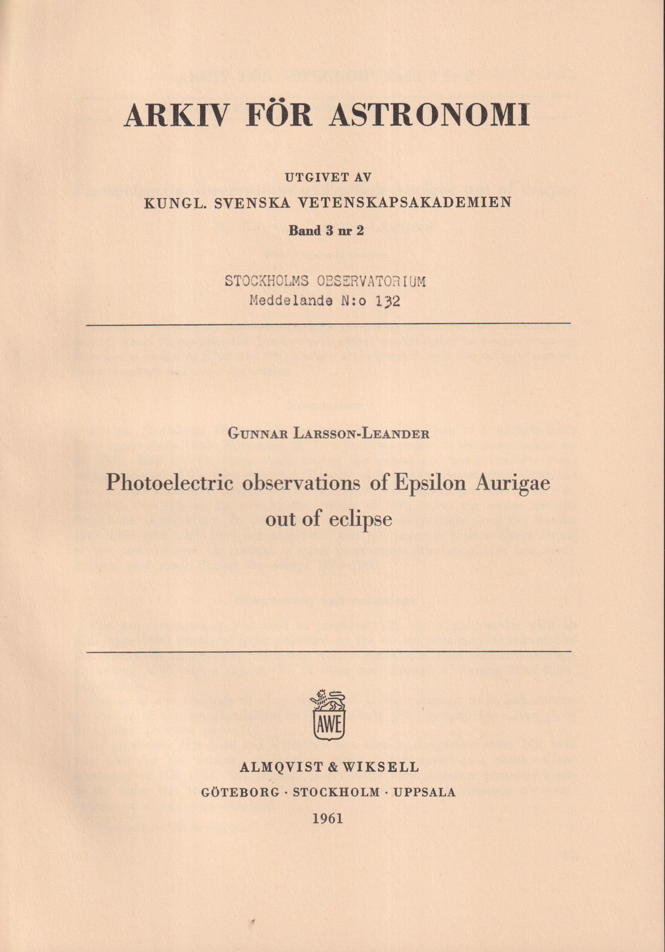 Meddelande från Stockholms Observatorium 132. Särtryck ur ‘Arkiv för Astronomi. 3:2, 1961’.