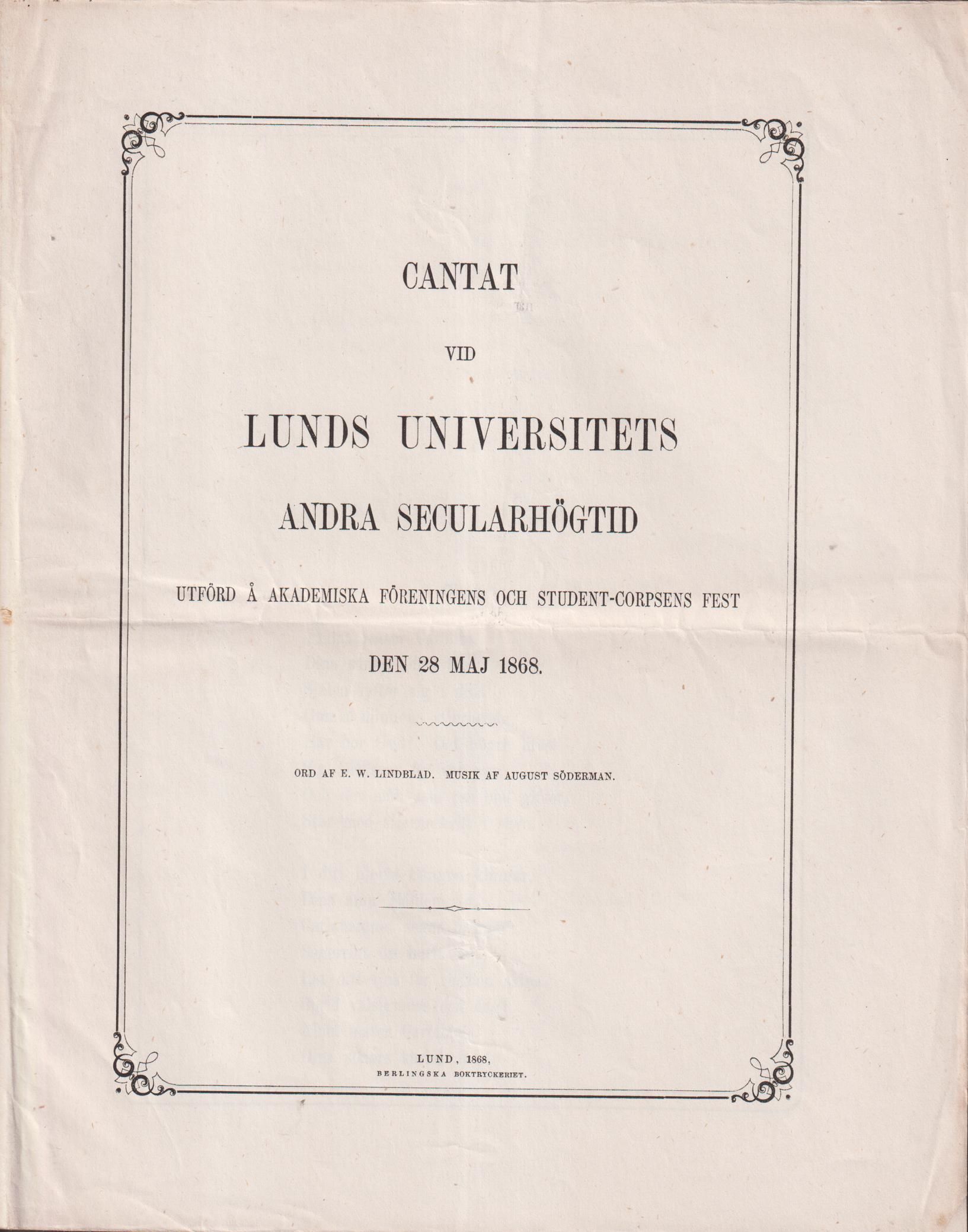Cantat vid Lunds universitets andra secularhögtid. Utförd å Akademiska föreningens och Student-Copsens fest den 28 maj 1868. Ord af E.W. Lindblad. Musik af August Söderman.