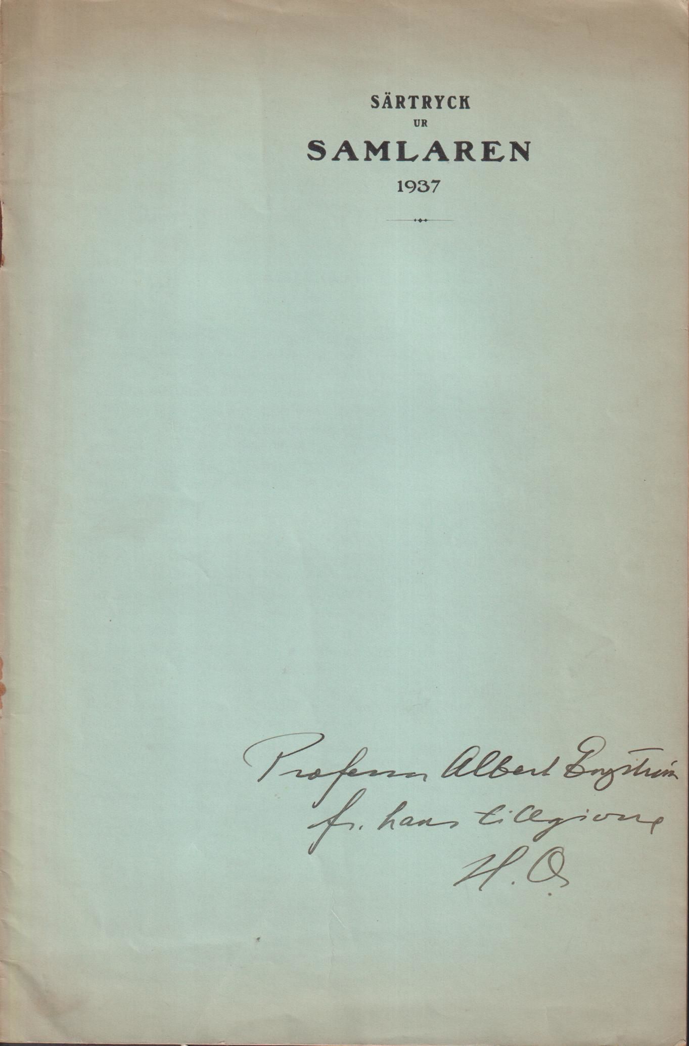 Uppsala, Almqvist & Wiksells Boktryckeri-A.-B., 1937. 8:o. s. [35]-52. Klammerhäftad med styvt tryckt grönt pappersomslag. Ryggen något nött och med sprickor. Tillskrift ‘Professor Albert Engström / fr. hans tillgivne H.O.’ på främre omslaget.