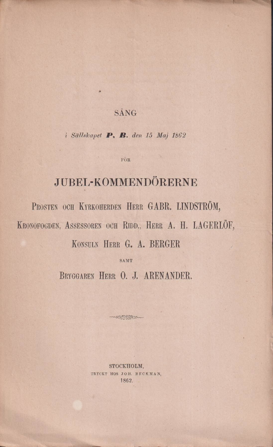Sång i Sällskapet P.B. den 15 maj 1862 för jubel-kommendörerne Prosten och kyrkoherden herr Gabr. Lindström, Kronofogden, assessoren och ridd. herr A.H. Lagerlöf, Konsuln herr G.A. Berger samt Bryggaren herr O.J. Arenander.
