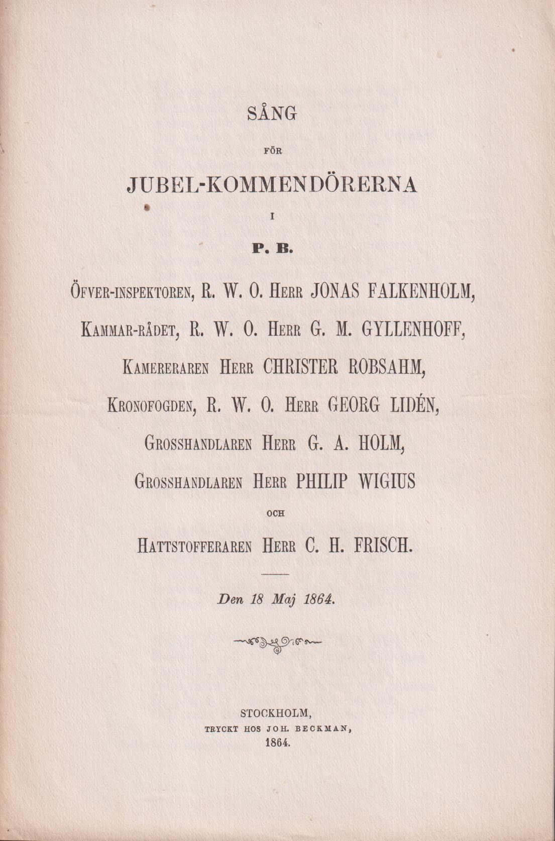 Sång för jubel-kommendörerna i P.B. Öfver-inspektoren, R.W.O. herr Jonas Falkenholm, Kammar-rådet, R.W.O. herr G.M. Gyllenhoff, Kamreraren herr Christer Robsahm, Kronofogden, R.W.O. herr Georg Lidén, Grosshandlaren herr G.A. Holm, Grosshandlaren herr Philip Wigius, och Hattstofferaren herr C.H. Frisch. Den 18 maj 1864.