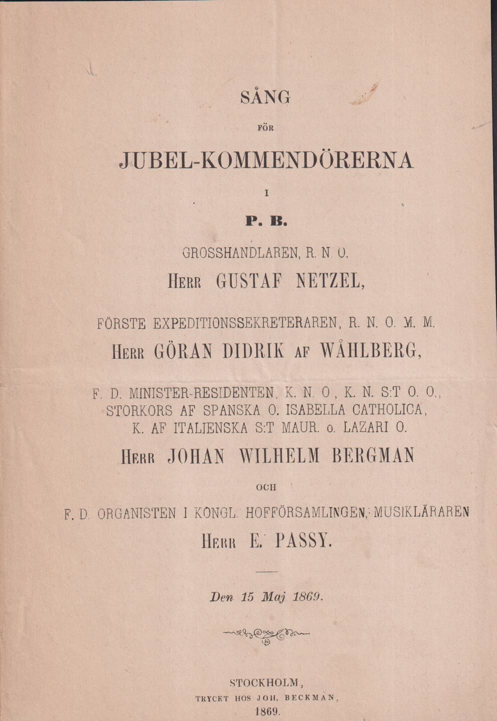 Sång för jubel-kommendörerna i P.B. Grosshandlaren, R.N.O. herr Gustaf Netzel Första expeditionssekreteraren, R.N.O. m.m. herr Göran Didrik af Wåhlberg, F.d. minister-presidenten, K.N.O., K.N. S:t O.O. Storkors af spanska O. Isabella Catholica, K. af italienska S:t Maur. o. Lazari O. herr Johan Wilhelm Bergman och F.d. organisten i Kongl. hofförsamlingen, musikläraren herr E. Passy. Den 15 maj 1869.