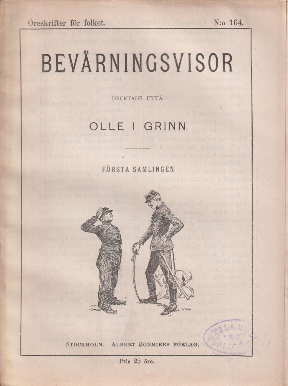 Öreskrifter för folket n:o 164. Omslagstitel något avvikande ‘Bevärningsvisor decktade uttå Olle i Grinn. Första samlingen’.