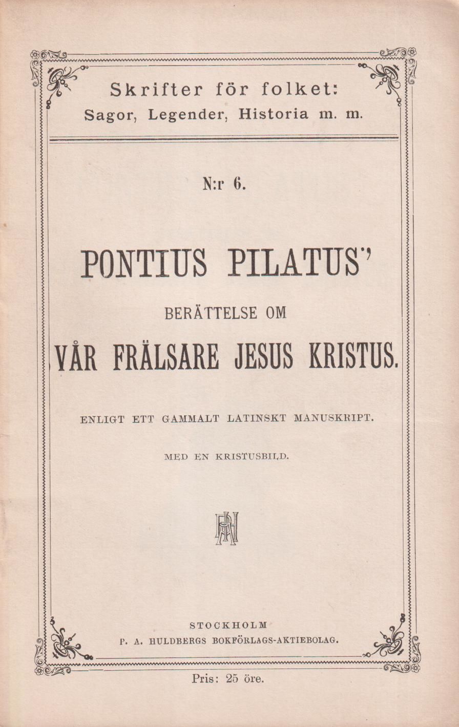 Den romerske landshöfdingen Pontius Pilatus’ berättelse om vår frälsare Jesus Kristus. Enligt ett gammalt latinskt manuskript. Öfversättning. [Utg. av] P.A. Huldbergs Bokförlags aktiebolag.
