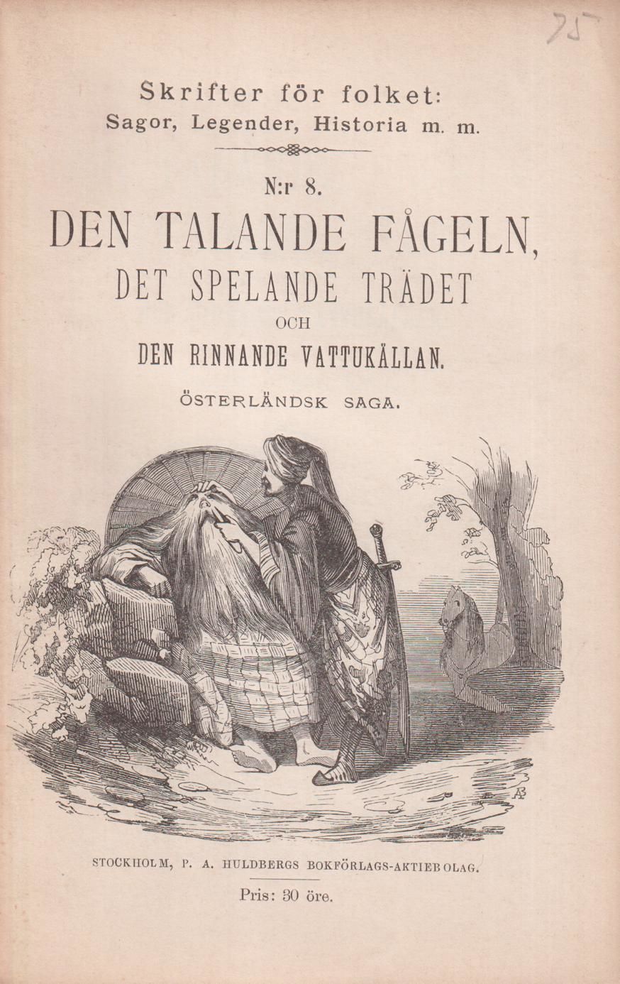 Den talande fågeln, det spelande trädet och den rinnande vattukällan. Österländsk saga. [Utg. av] P.A. Huldbergs Bokförlags-aktiebolag.