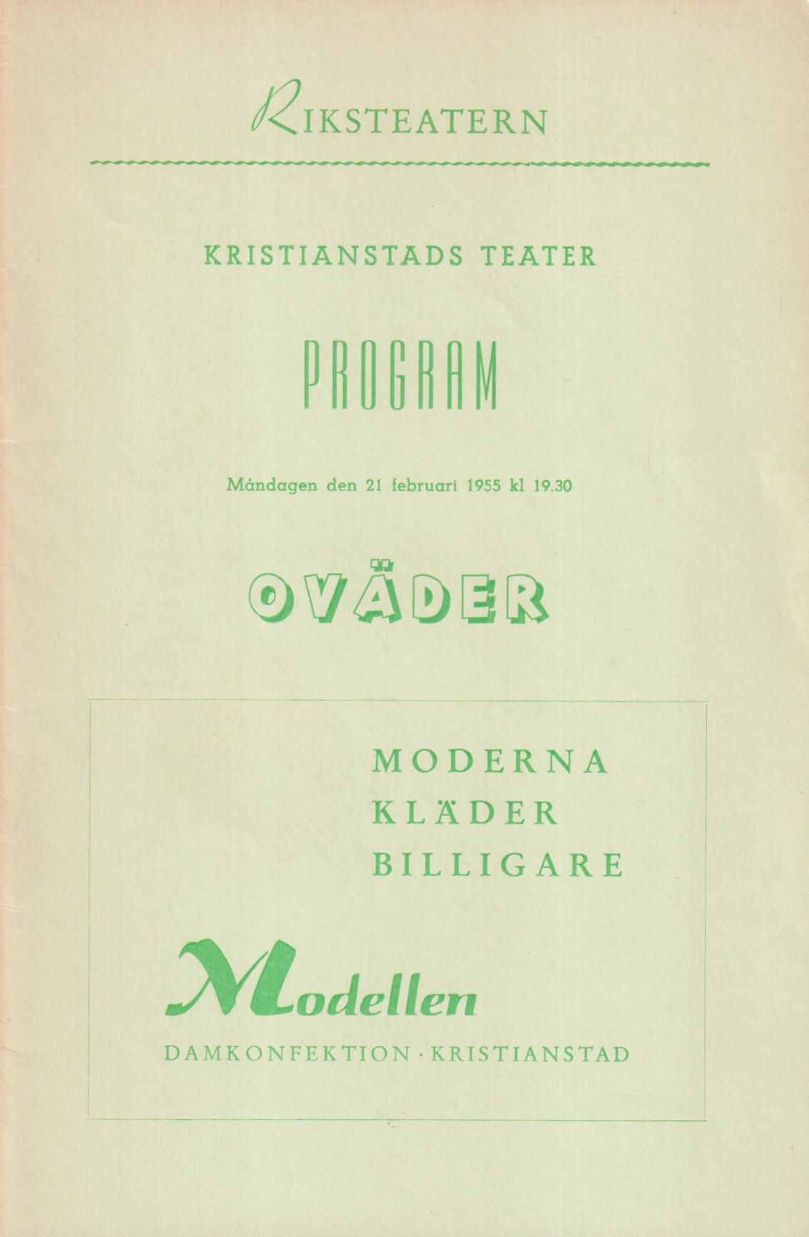 Kristianstads teater. Program. Måndagen den 21 februari 1955 kl 19.30. Oväder. [= omslagstitel].