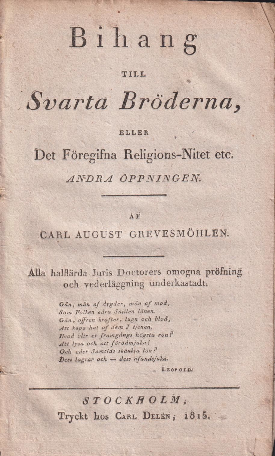 Stockholm, tryckt hos Carl Delén, 18158:o. 14 s., (1 blankt) bl. Tagen ur band. Bindtråden borta så läggen isär.