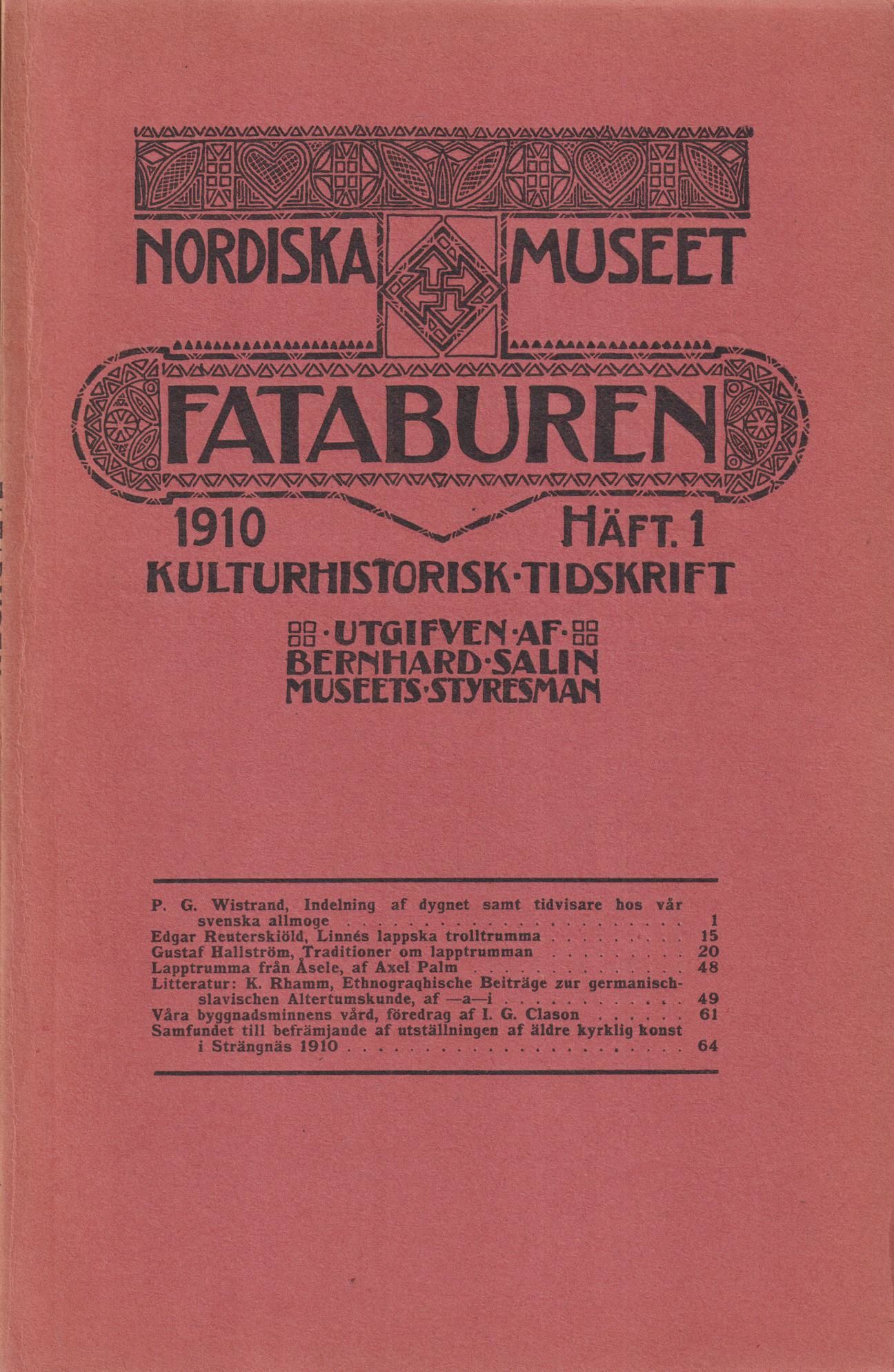 Innehåll: Indelning af dygnet samt tidvisare hos vår svenska allmoge, av P.G. Wistrand; Linnés lappska trolltrumma, av Edgar Reuterskiöld; Traditioner om lapptrumman, av Gustaf Hallström; Lapptrumman från Åsele, av Axel Palm; Litteratur [recensioner]; Våra byggnadsminnens vård, föredrag av I.G. Clason; Samfundet till befrämjande af utställningen af äldre kyrklig konst i Strängnäs 1910.