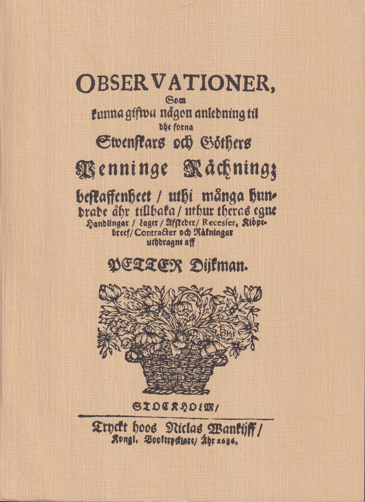 Observationer, som kunna gifwa någon anledning til dhe forna swenskars och göthers penninge rächningz beskaffenheet / uthi många hundrade åhr tillbaka, uthur theras egne handlingar / lager / afskeder / recesser, kiöpebreef / contracter och räkningar uthdragne aff Petter Dijkman. [Utg. av] Numismatiska litteratursällskapet.