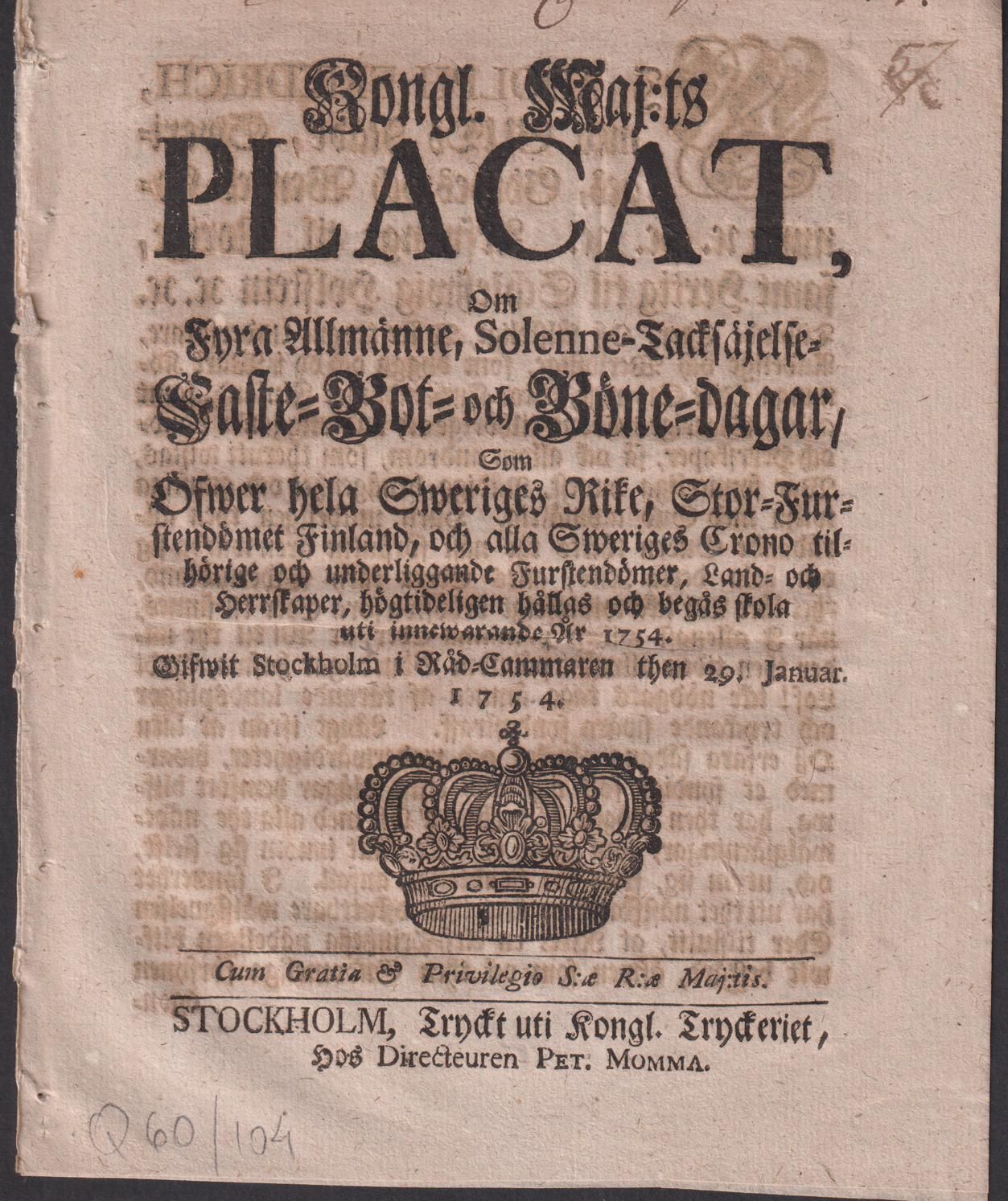 Kongl. Maj:ts Placat, Om Fyra Allmänne, Solenne Tacksäjelse- Faste- Bot- och Böne-dagar, Som Öfwer hela Sweriges Rike, Stor-Furstendömet Finland, och alla Sweriges Crono tilhörige och underliggande Furstendömer, Land- och Herrskaper, högtideligen hållas och begås skola uti innewarande År 1754. Gifwit Stockholm i Råd-Cammaren then 29. Januar. 1754.