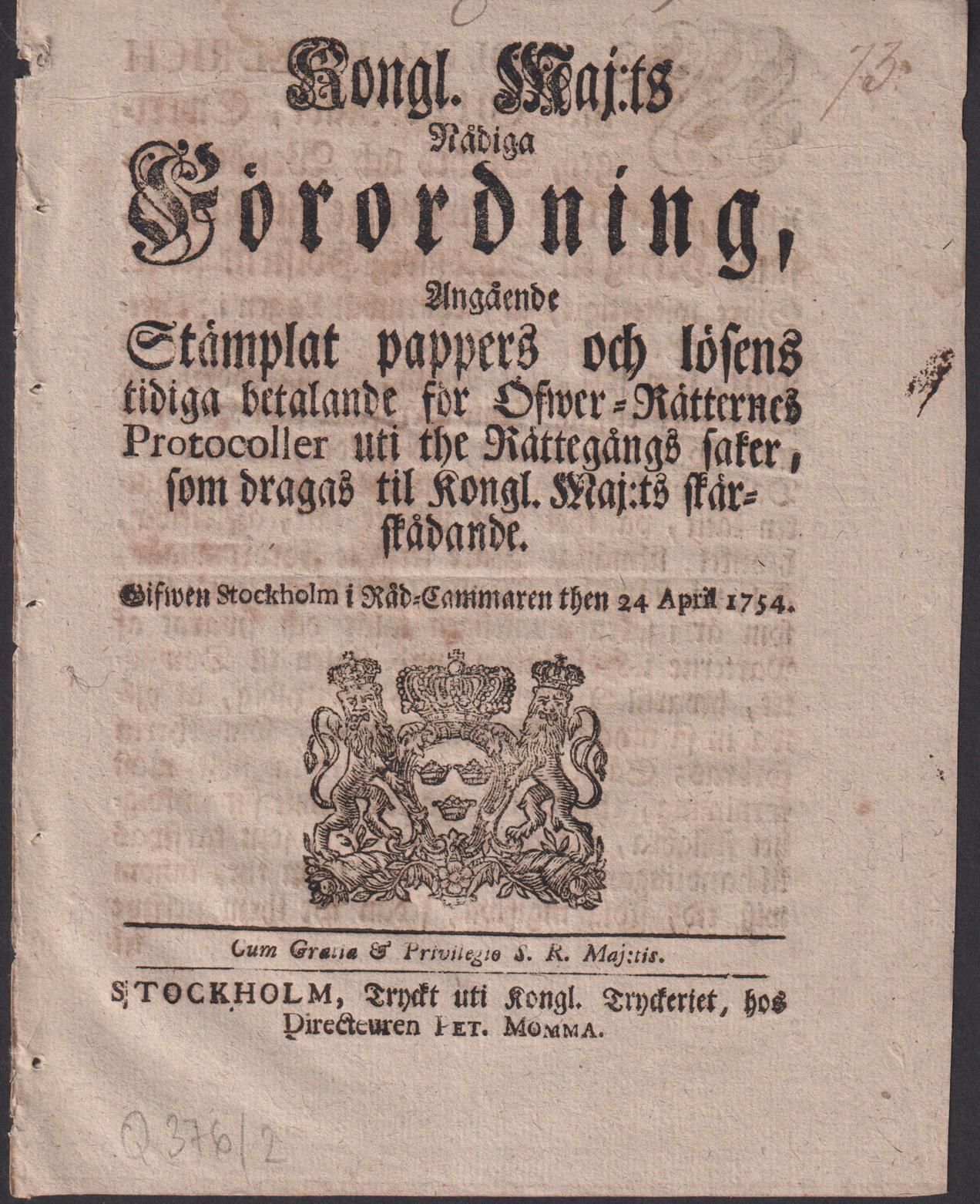 Kongl. Maj:ts Nådiga Förordning, Angående Stämplat pappers och lösens tidiga betalande för Öfwer-Rätternes Protocoller uti the Rättegångs saker, som dragas til Kongl. Maj:ts skärskådande. Gifwen Stockholm i Råd-Cammaren then 24 April 1754.