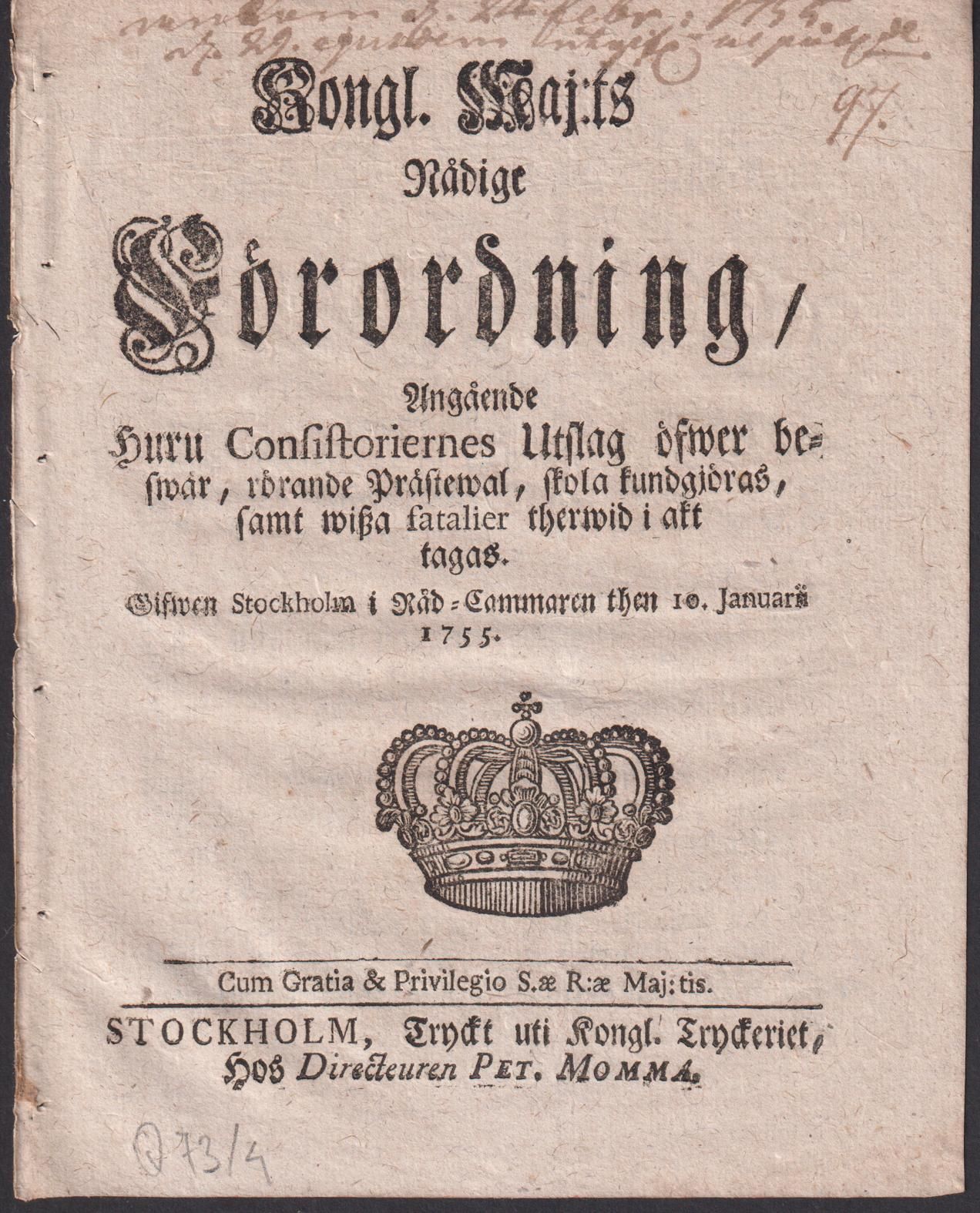 Kongl. Maj:ts Nådige Förordning, Angående Huru Consistoriernes Utslag öfwer beswär, rörande Prästewal, skola kundgjöras, samt wisza fatalier therwid i akt tagas. Gifwen Stockholm i Råd-Cammaren then 10. Januarii 1755.