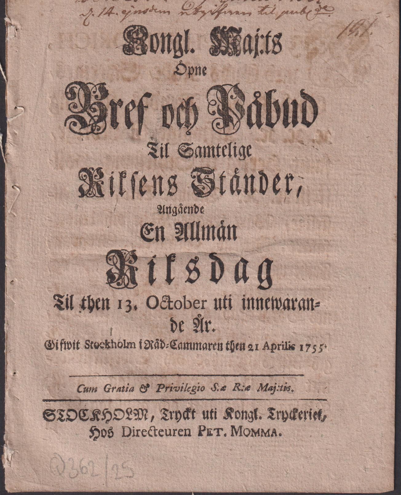 Kongl. maj:ts öpne bref och påbud til samtelige riksens ständer, angående en allmän riksdag til then 13. october uti innewarande år. Gifwit Stockholm i råd-cammaren then 21 aprilis 1755.