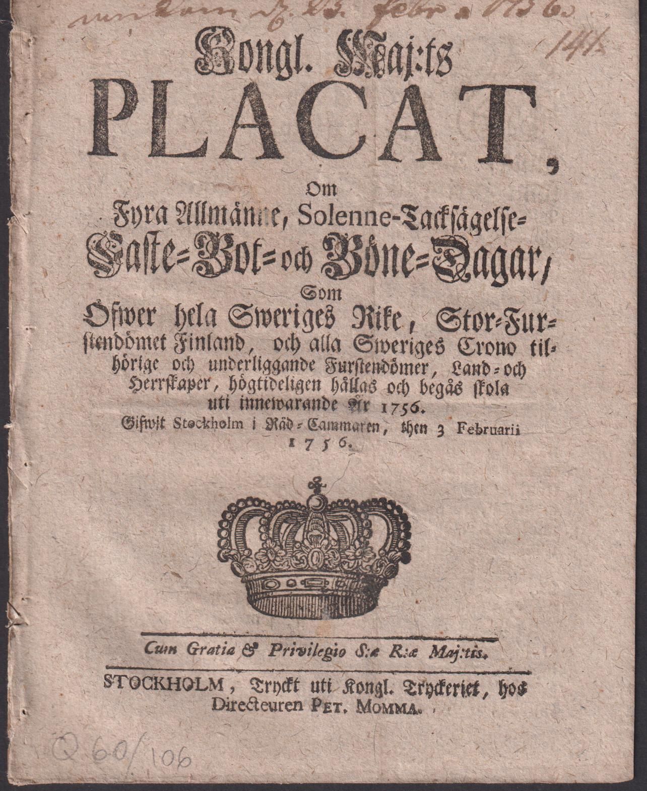Kongl. Maj:ts Placat, Om Fyra Allmänne, Solenne Tacksägelse- Faste- Bot- och Böne-Dagar, Som Öfwer hela Sweriges Rike, Stor-Furstendömet Finland, och alla Sweriges Crono tilhörige och underliggande Furstendömer, Land- och Herrskaper, högtideligen hållas och begås skola uti innewarande År 1756. Gifwit Stockholm i Råd-Cammaren, then 3 Februarii 1756.