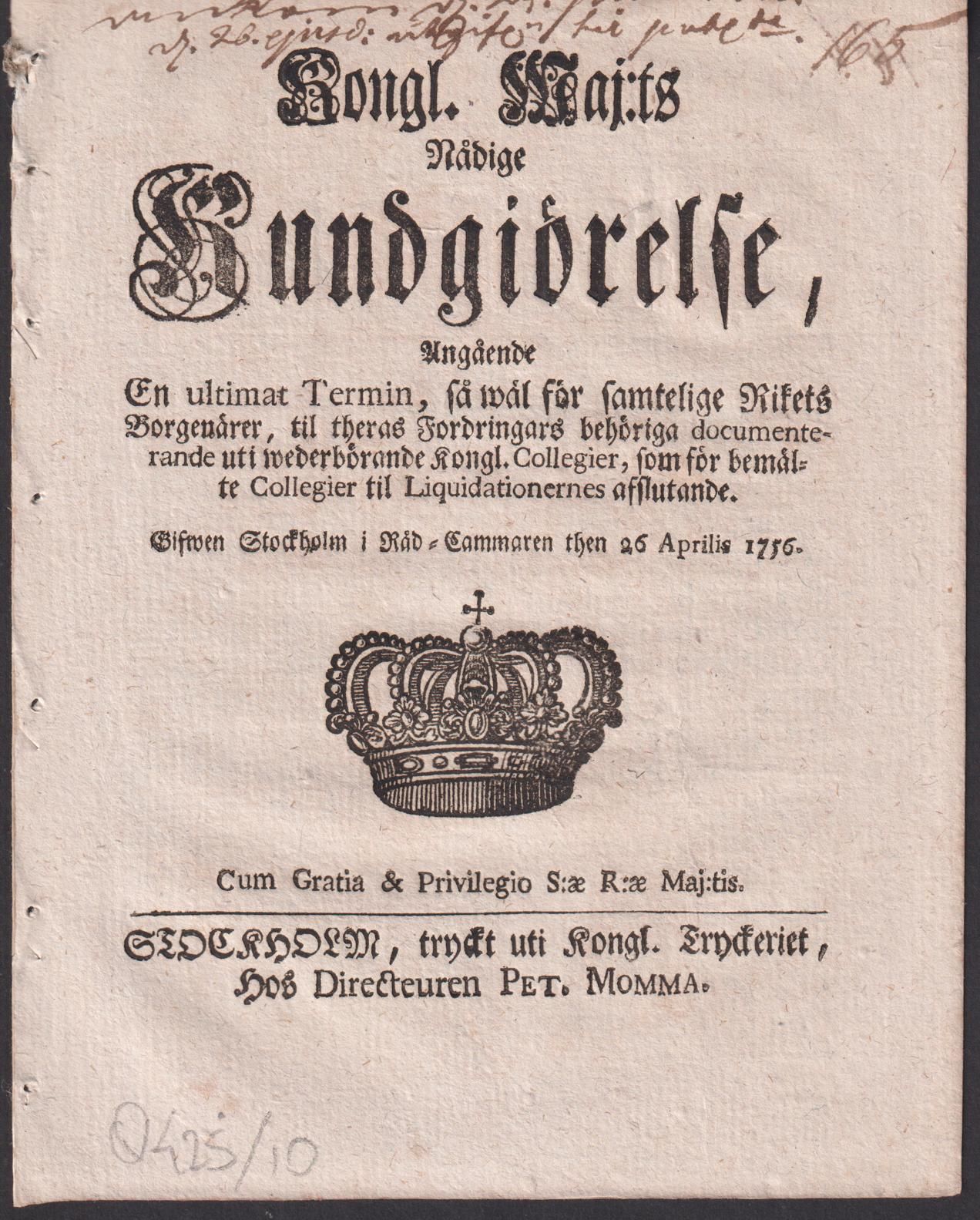 Kongl. Maj:ts Nådige Kundgiörelse, Angående En ultimat Termin, så wäl för samtelige Rikets Borgenärer, til theras Fordringars behöriga documenterande uti wederbörande Kongl. Collegier, som för bemälte Collegier til Liquidationernes afslutande. Gifwen Stockholm i Råd-Cammaren then 26 Aprilis 1756.