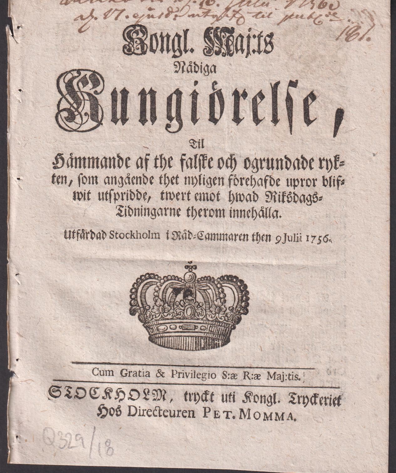 Kongl. Maj:ts Nådiga Kungiörelse, Til Hämmande af the falske och ogrundade rykten, som angående thet nyligen förehafde upror blifwit utspridde, twert emot hwad Riksdags-Tidningarne therom innehålla. Utfärdad Stockholm i Råd-Cammaren then 9 Julii 1756.