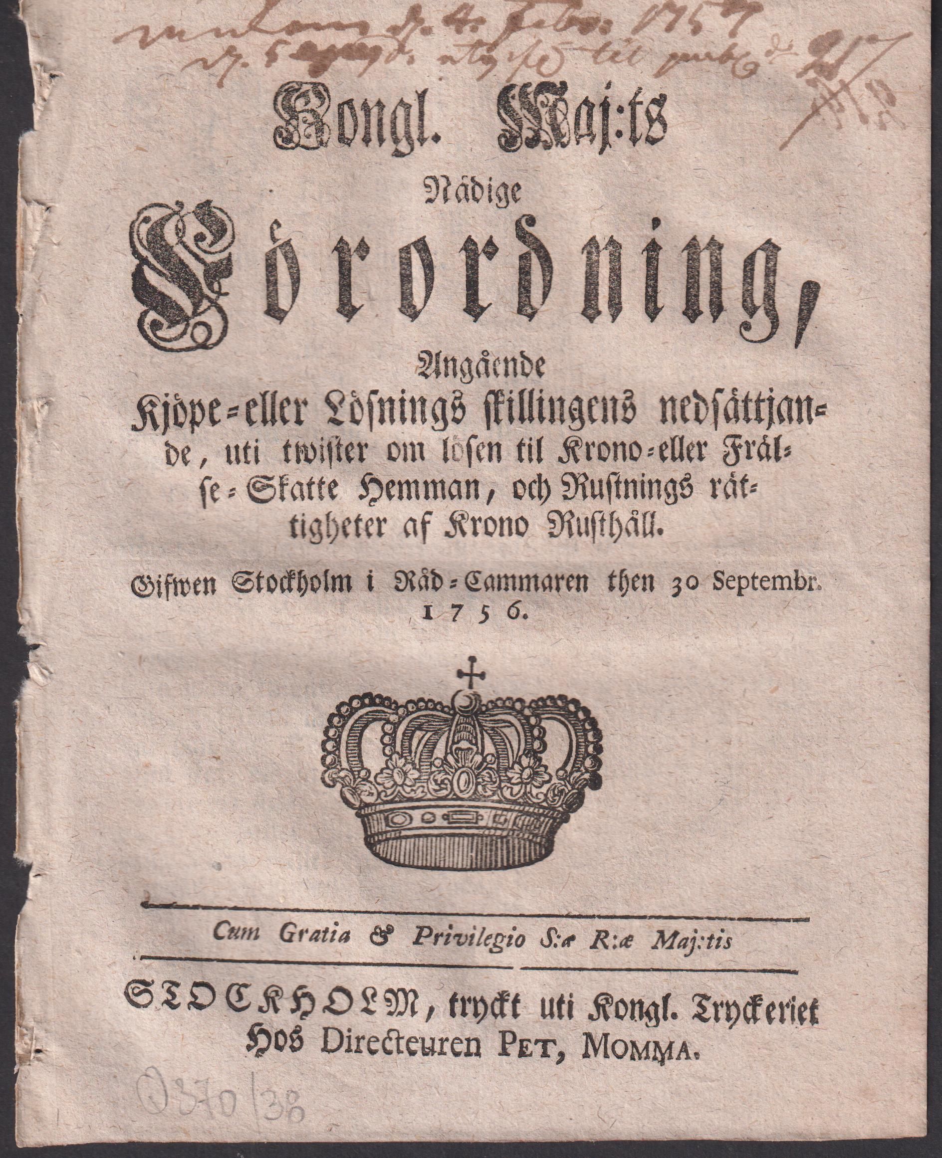 Kongl. Maj:ts Nådige Förordning, Angående Kjöpe- eller Lösnings skillingens nedsättjande, uti twister om lösen til Krono- eller Frälse-Skatte Hemman, och Rustnings rättigheter af Krono Rusthåll. Gifwen Stockholm i Råd-Cammaren then 30 Septembr. 1756.