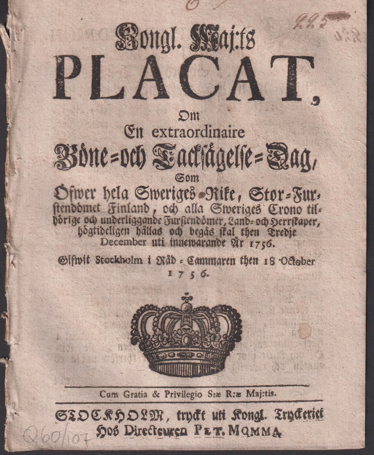 Kongl. Maj:ts Placat, Om En extraordinarie Böne- och Tacksägelse-Dag, Som Öfwer hela Sweriges Rike, Storfurstendömet Finland, och alla Sweriges Crono tilhörige och underliggande Furstendömer, Land- och Herrskaper, högtideligen hållas och begås skal then Tredje December uti innewarande År 1756. Gifwen Stockholm i Råd-Cammaren then 18 October 1756.