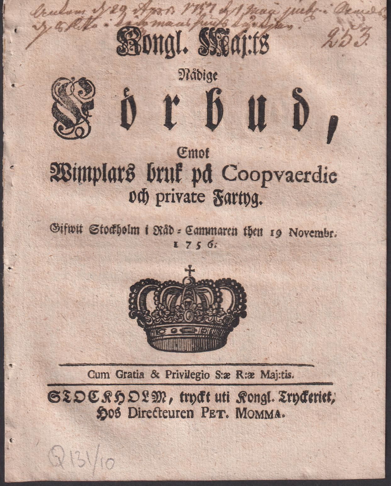 Kongl. Maj:ts Nådige Förbud, Emot Wimplars bruk på Coopvaerdie och private Fartyg. Gifwit Stockholm i Råd-Cammaren then 19 Novembr. 1756.