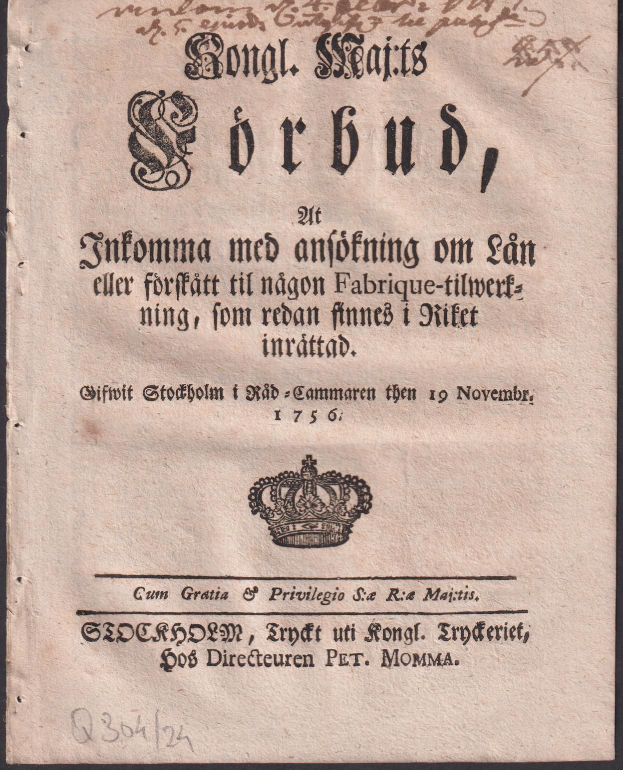 Kongl. Maj:ts Förbud, At Inkomma med ansökning om Lån eller förskått til någon Fabrique-tilwerkning, som redan finnes i Riket inrättad. Gifwen Stockholm i Råd-Cammaren then 19 Novembr. 1756.