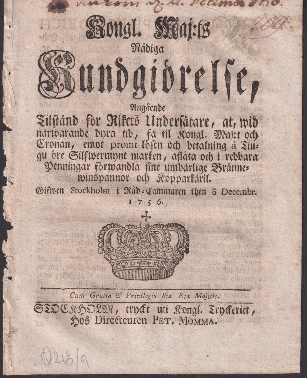 Kongl. Maj:ts Nådiga Kundgiörelse, Angående Tilstånd för Rikets Undersåtare, at, wid närwarande dyra tid, få til Kongl. Maj:t och Cronan, emot promt lösen och betalning à Tiugu öre Silfwermynt marken, aflåta och i redbara Penningar förwandla sine umbärlige Brännewinspannor och Kopparkäril. Gifwen Stockholm i Råd-Cammaren then 8 Decembr. 1756.