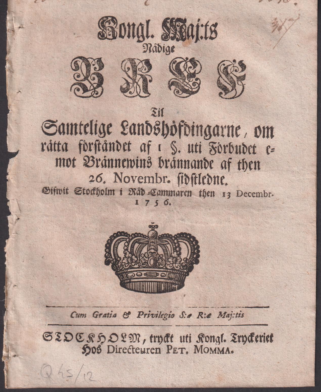 Kongl. Maj:ts Nådige Bref Til Samtelige Landshöfdingarne, om rätta förståndet af 1 §. uti Förbudet emot Brännewins brännande af then 26. Novembr. sidstledne. Gifwen Stockholm i Råd-Cammaren then 13 Decembr. 1756.