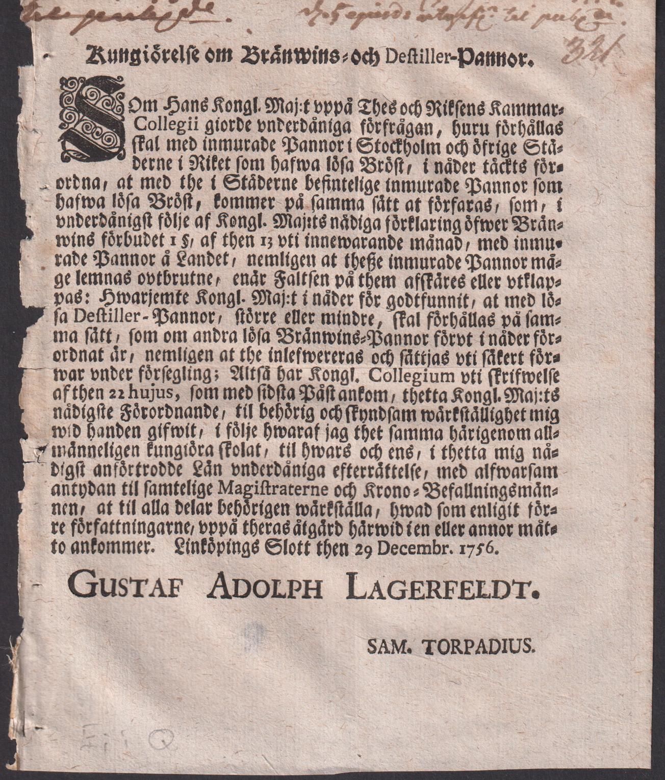 Ej i Quiding. Daterad ‘Linköpings Slott then 29 Decembr. 1756’, signerad ‘Gustaf Adolph Lagerfeldt’, kontrasignerad ‘Sam. Torpadius’.