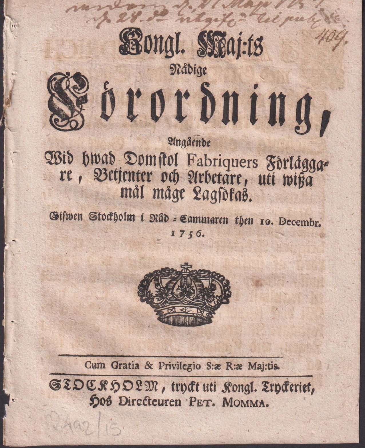 Kongl. Maj:ts Nådige Förordning, Angående Wid hwad Domstol Fabriquers Förläggare, Betjenter och Arbetare, uti wisza mål måge Lagsökas. Gifwen Stockholm i Råd-Cammaren then 10. Decembr. 1756.