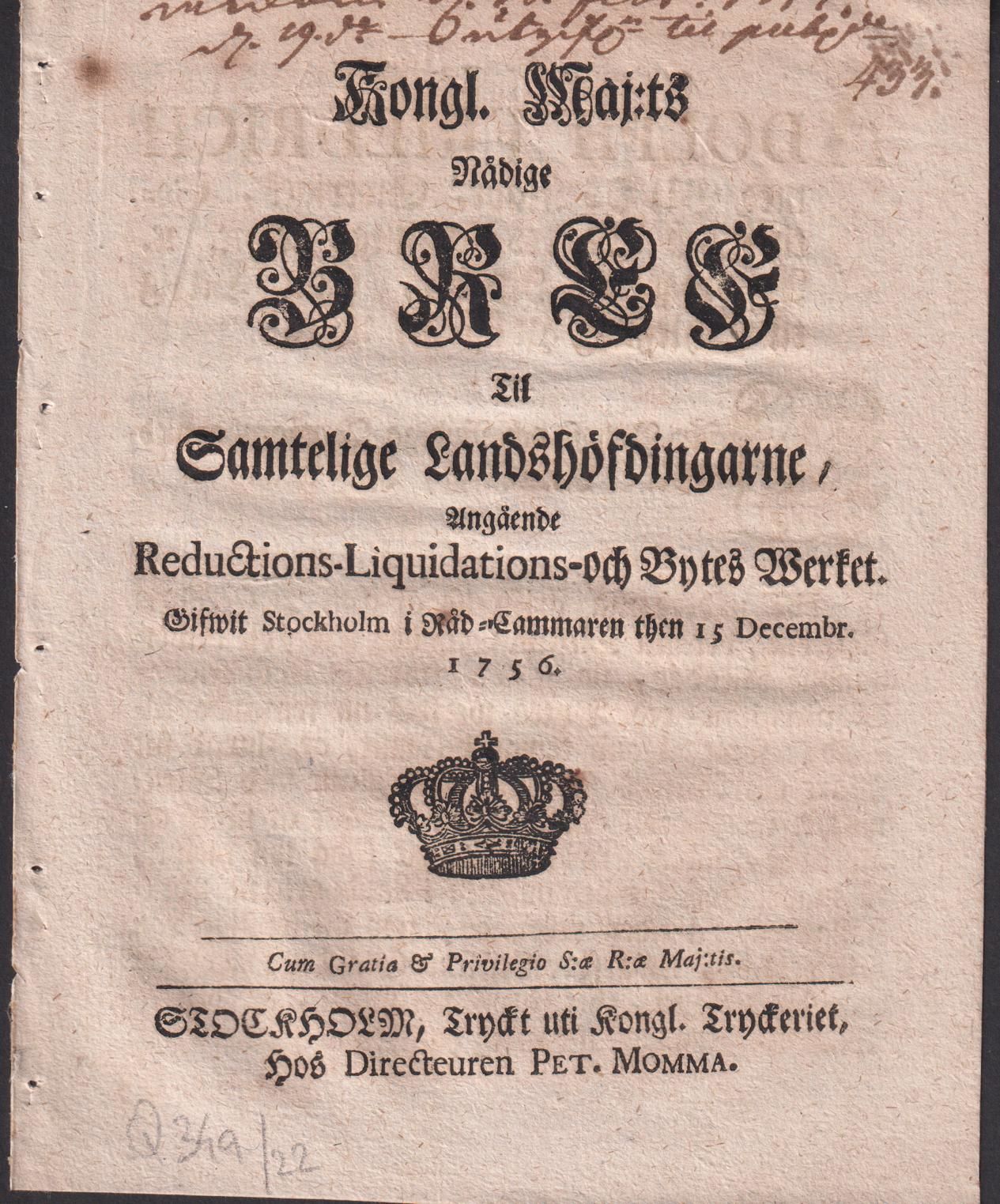 Kongl. Maj:ts Nådige Bref Til Samtelige Landshöfdingarne, Angående Reductions-Liquidations- och Bytes Werket. Gifwit Stockholm i Råd-Cammaren then 15 Decembr. 1756.