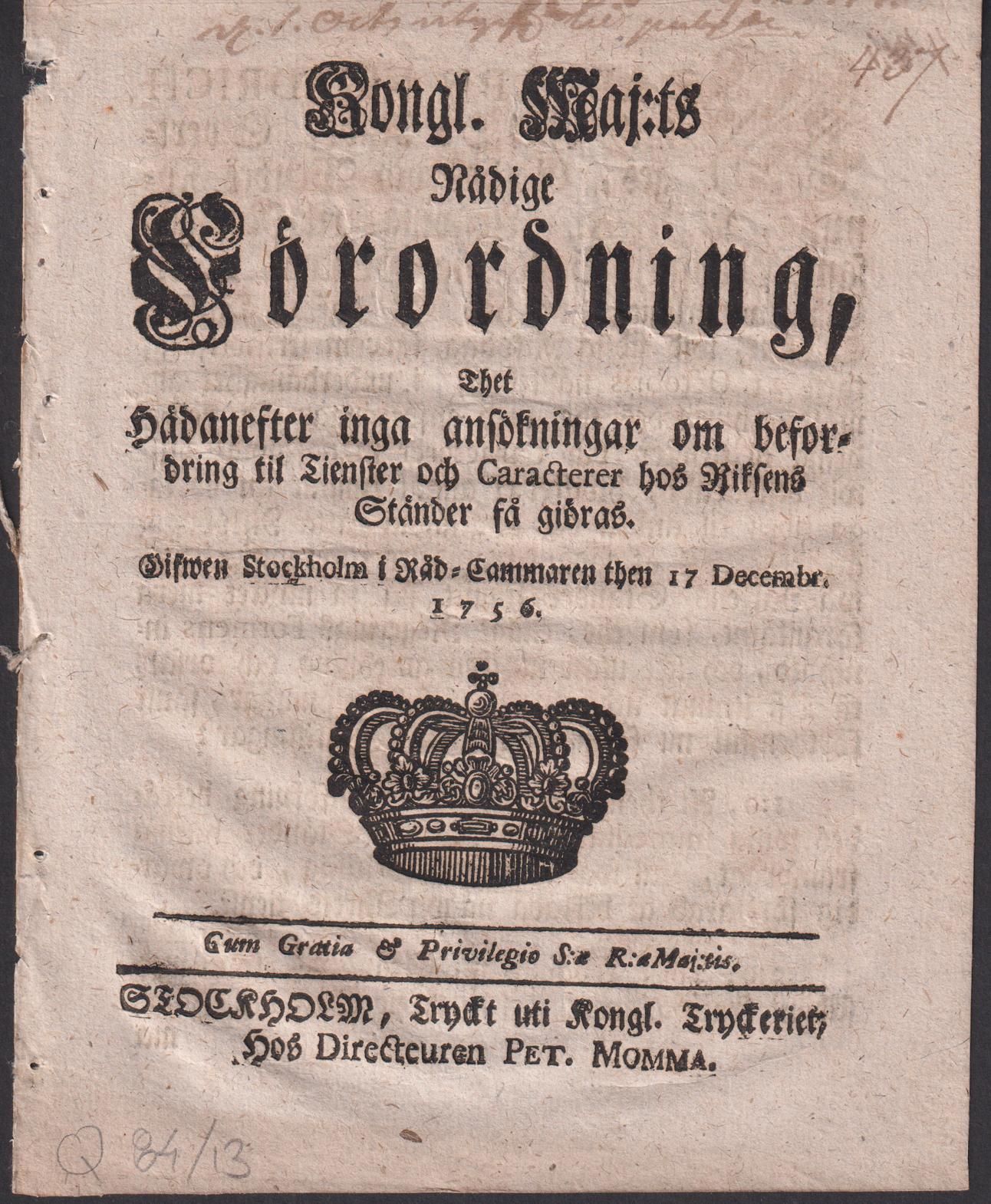 Kongl. Maj:ts Nådige Förordning, Thet Hädanefter inga ansökningar om befordring til Tienster och Caracterer hos Riksens Ständer få giöras. Gifwen Stockholm i Råd-Cammaren then 17 Decembr. 1756.