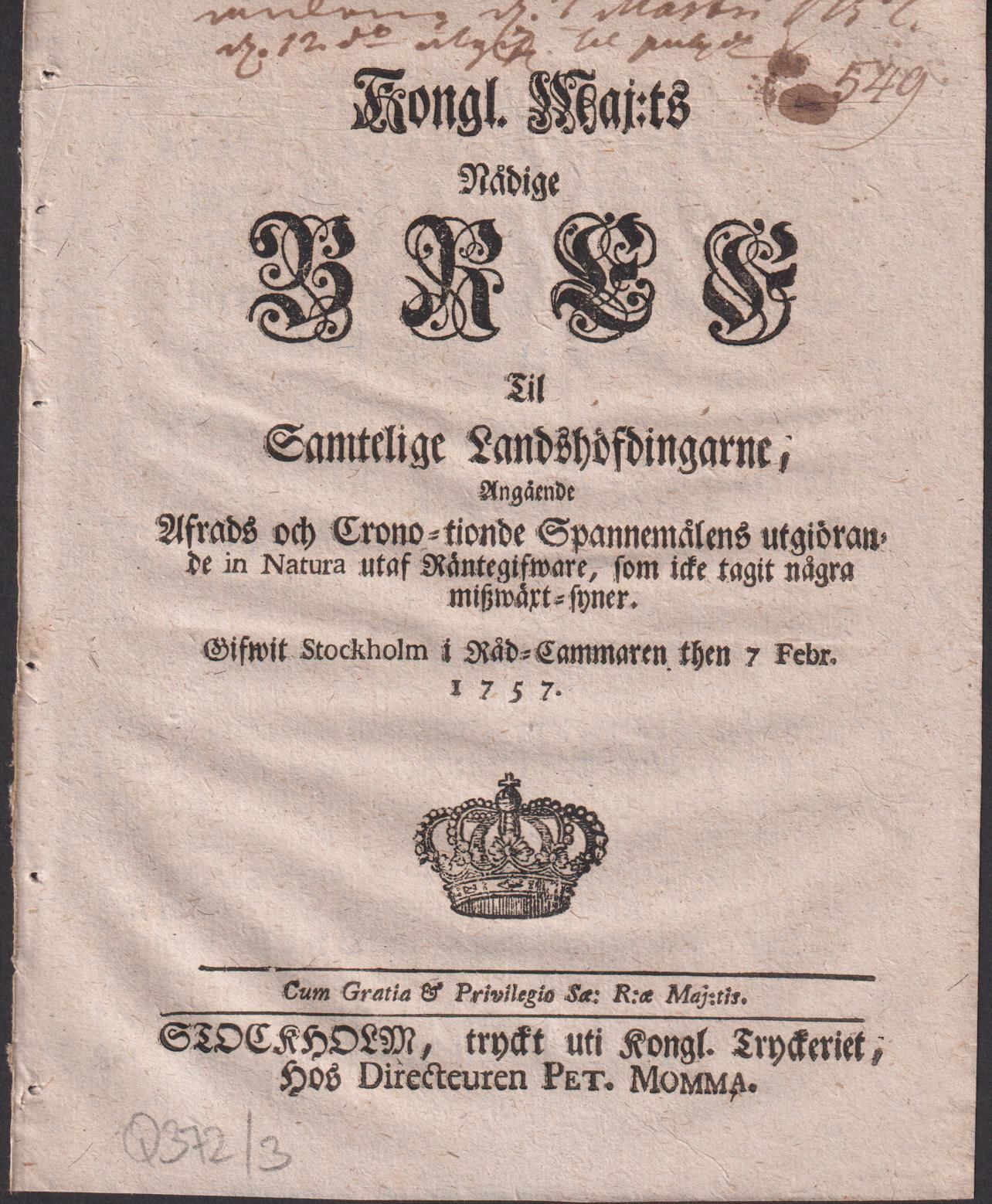 Kongl. maj:ts nådige Bref Til Samtelige Landshöfdingarne, Angående Afrads och Crono-tionde Spannemålens utgiörande in Natura utaf Räntegifware, som icke tagit några miszwäxt-syner. Gifwit Stockholm i Råd-Cammaren then 7 Febr. 1757.