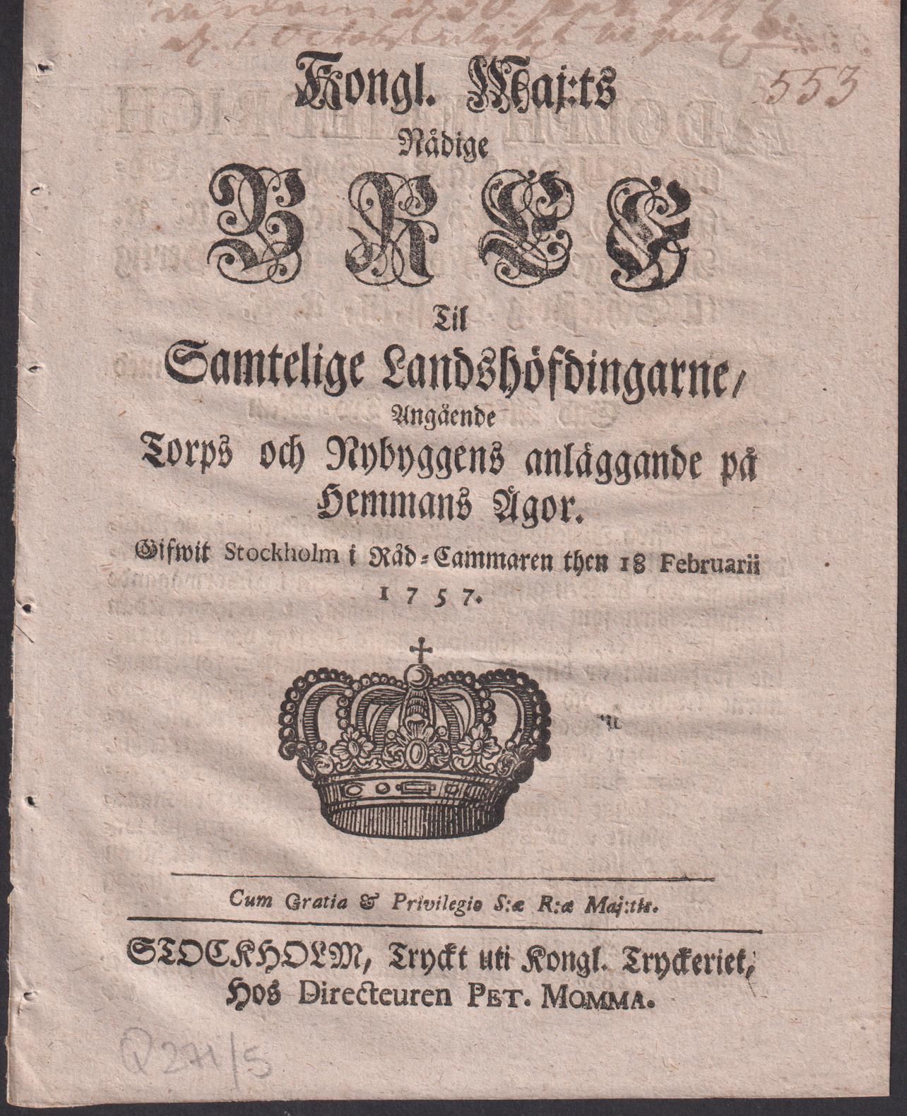 Kongl. maj:ts nådige Bref Til Samtelige Landshöfdingarne, Angående Torps och Nybyggens anläggande på Hemmans Ägor. Gifwit Stockholm i Råd-Cammaren then 18 Februarii 1757.