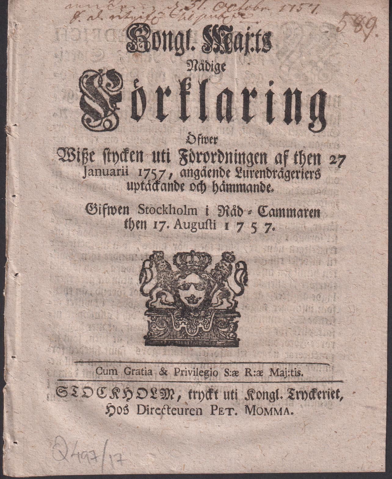 Kongl. maj:ts nådige Förklaring Öfwer Wisze stycken uti Förordningen af then 27 Januarii 1757, angående Lurendrägeriers uptäckande och hämmande. Gifwen Stockholm i Råd-Cammaren then 17. augusti 1757.