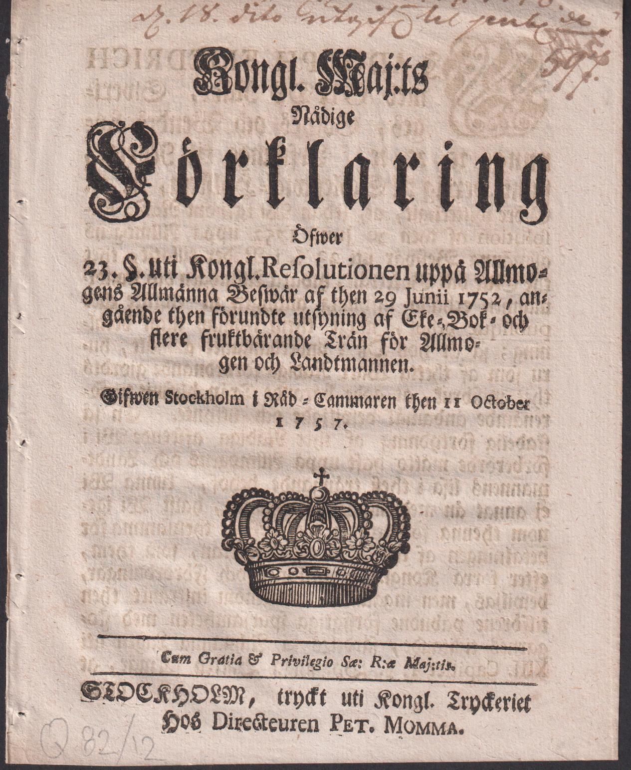 Kongl. maj:ts nådige Förklaring Öfwer 23. §. Uti Kongl. Resolutionen uppå Allmogens Allmänna Beswär af then 29 Junii 1752, angående then förunte utsyning af Eke- Bok- och flere fruktbärande Trän för Allmogen och Landtmannen. Gifwen Stockholm i Råd-Cammaren then 11 october 1757.