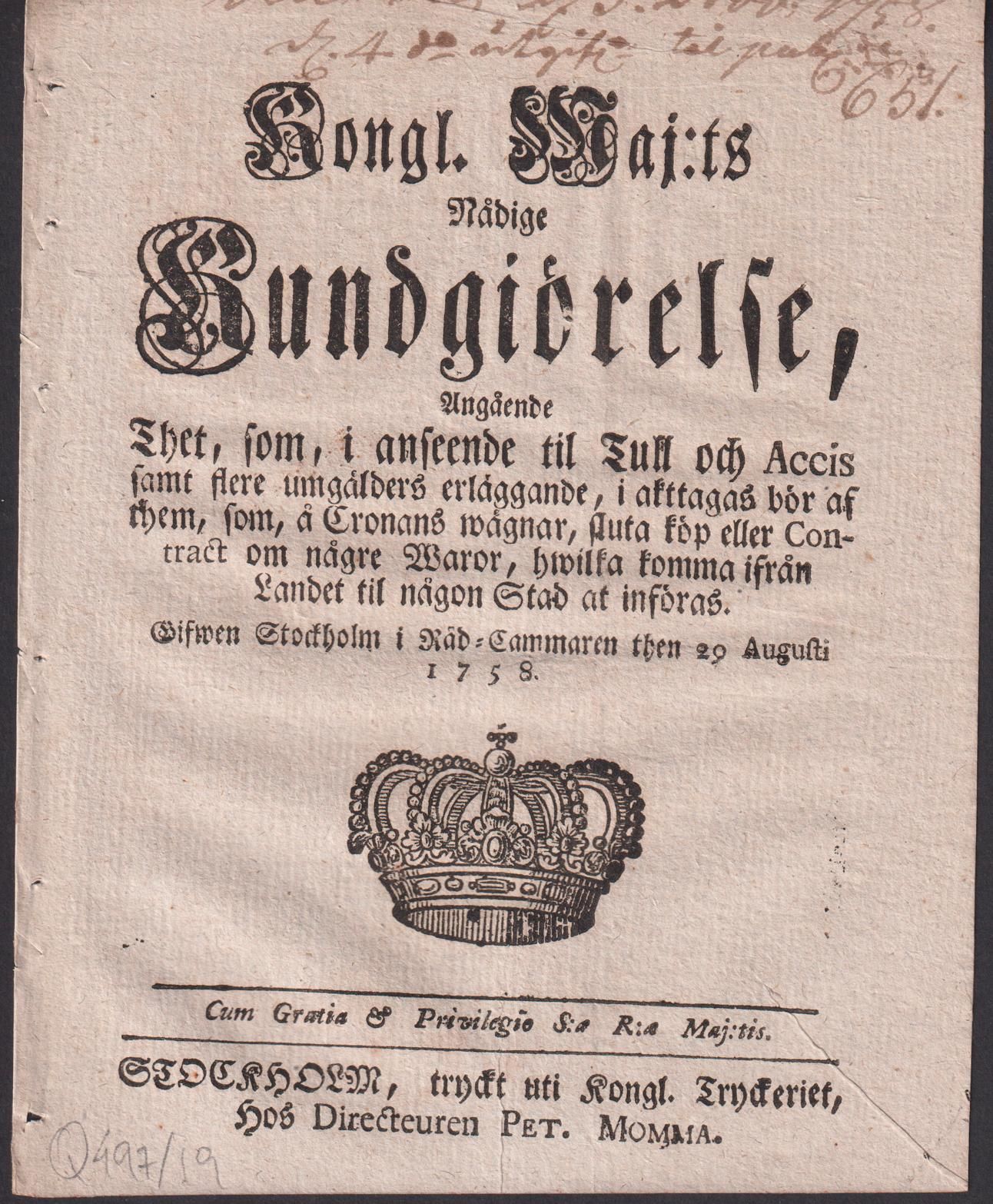 Kongl. maj:ts nådige Kundgiörelse, Angående Thet, som, i anseende til Tull och Accis samt flere umgälders erläggande, i akttagas bör af them, som, å Cronans wägnar, sluta köp eller Contract om någre Waror, hwilka komma ifrån Landet til någon Stad at införas. Gifwen Stockholm i Råd-Cammaren then 29 augusti 1758.