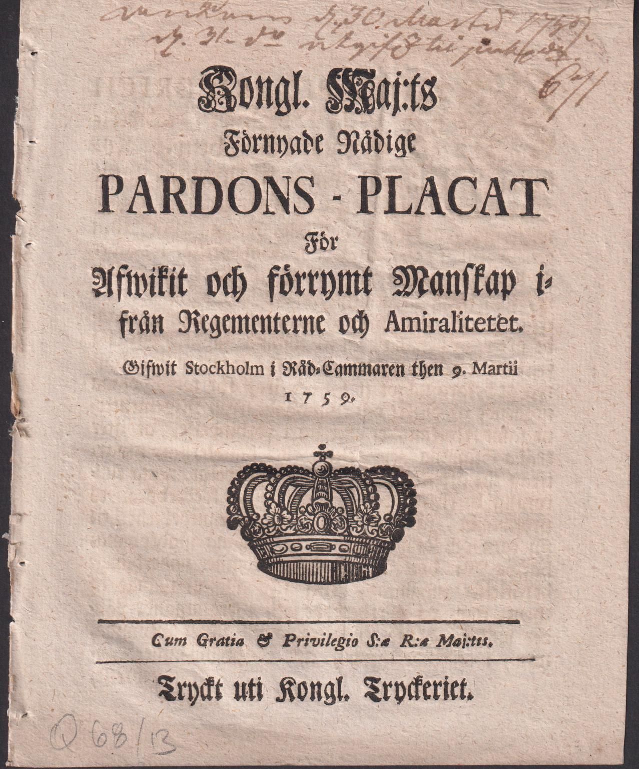 Kongl. Maj:ts Förnyade Nådige Pardons-Placat För Afwikit och förrymt Manskap ifrån Regementerne och Amiralitetet. Gifwit Stockholm i Råd-Cammaren then 9. Martii 1759.