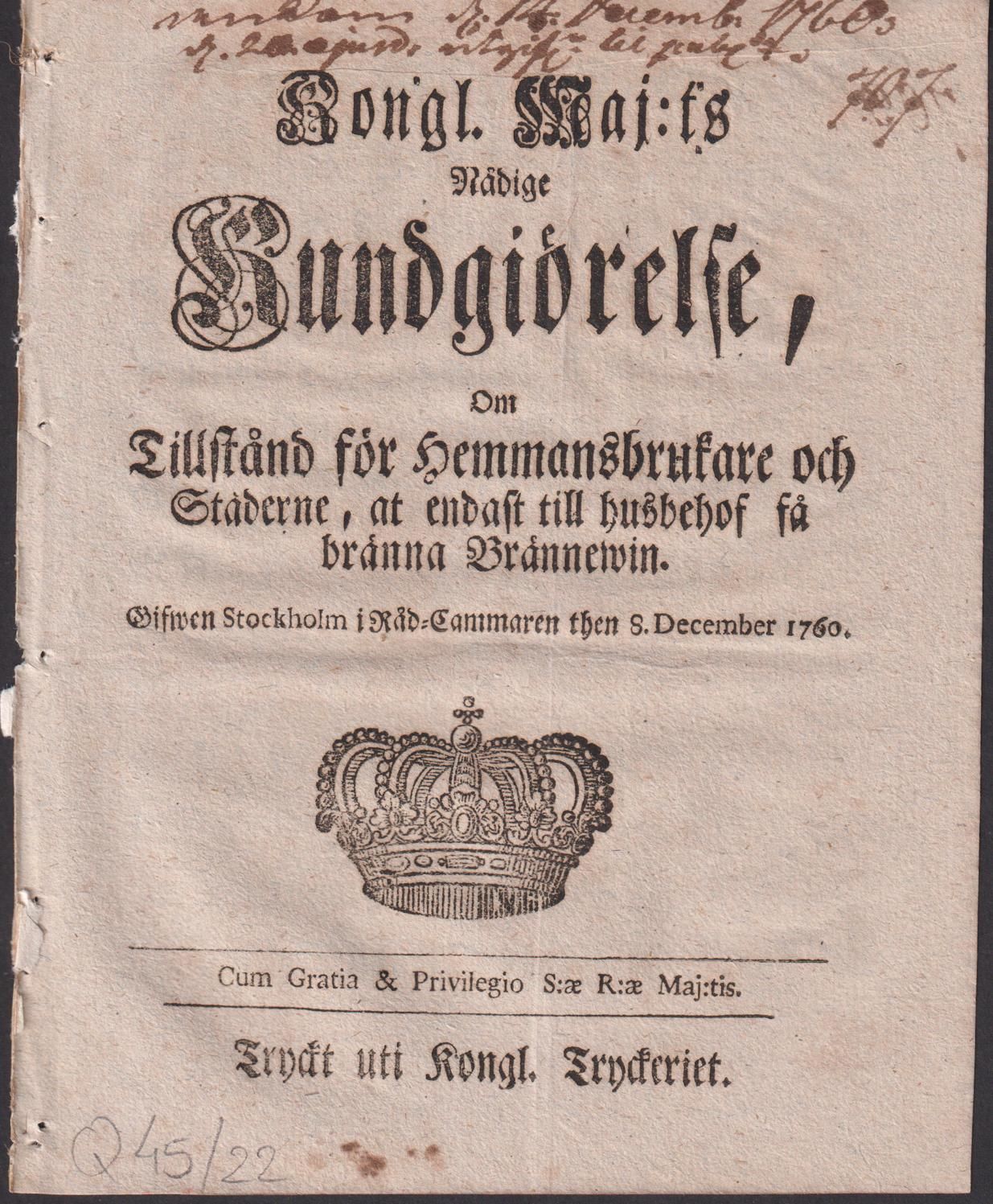 Kongl. Maj:ts Nådige Kundgiörelse, Om Tillstånd för Hemmansbrukare och Städerne, at endast till husbehof få bränna Brännewin. Gifwen Stockholm i Råd-Cammaren then 8. December 1760.