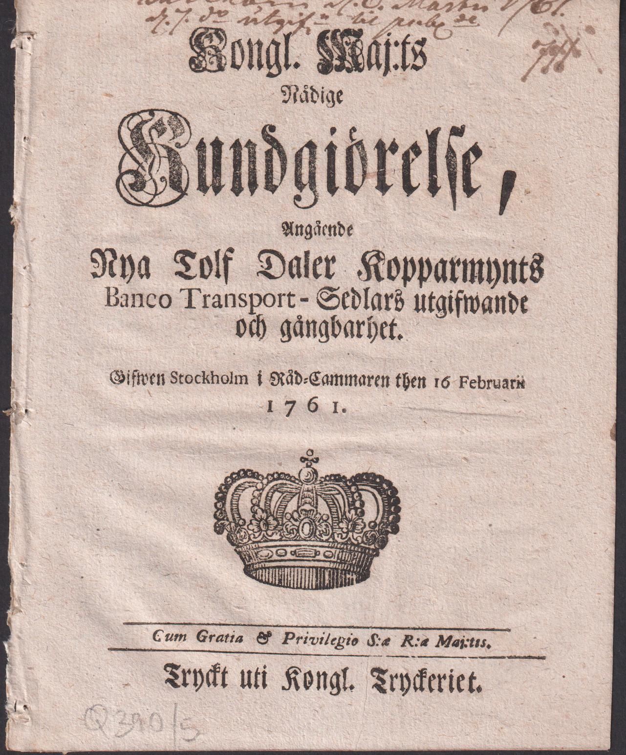 Kongl. Maj:ts Nådige Kundgiörelse, Angående Nya Tolf Daler Kopparmynts Banco Transport-Sedlars utgifwande och gångbarhet. Gifwen Stockholm i Råd-Cammaren then 16 Februarii 1761.