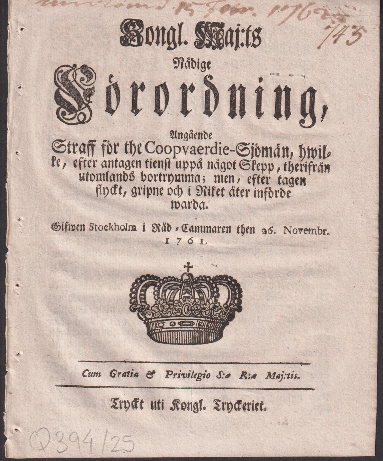 Kongl. Maj:ts Nådige Förordning, Angående Straff för the Coopvaerdie-Sjömän, hwilke, efter antagen tienst uppå något Skepp, therifrån utomlands bortrymma; men, efter tagen flyckt, gripne och i Riket åter införde warda. Gifwen Stockholm i Råd-Cammaren then 26. Novembr. 1761.