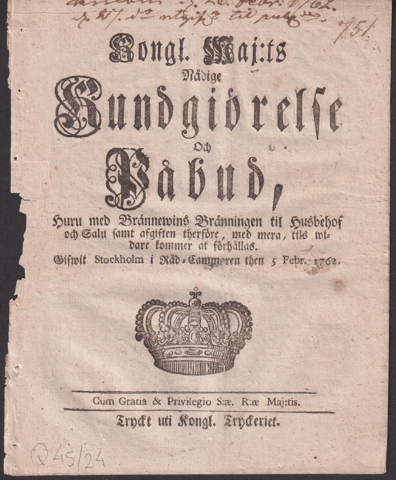 Kongl. Maj:ts Nådige Kundgiörelse Och Påbud, Huru med Brännewins Bränningen til Husbehof och Salu samt afgifter therföre, med mera, tils widare kommer at förhållas. Gifwit Stockholm i Råd-Cammaren then 5 Febr. 1762.