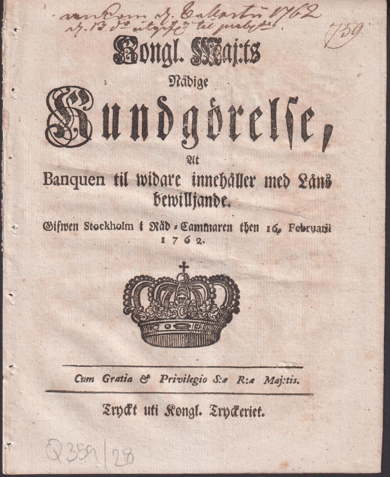 Kongl. Maj:ts Nådige Kundgörelse, At Banquen til widare innehåller med Låns bewilljande. Gifwen Stockholm i Råd-Cammaren then 16. Februarii 1762.