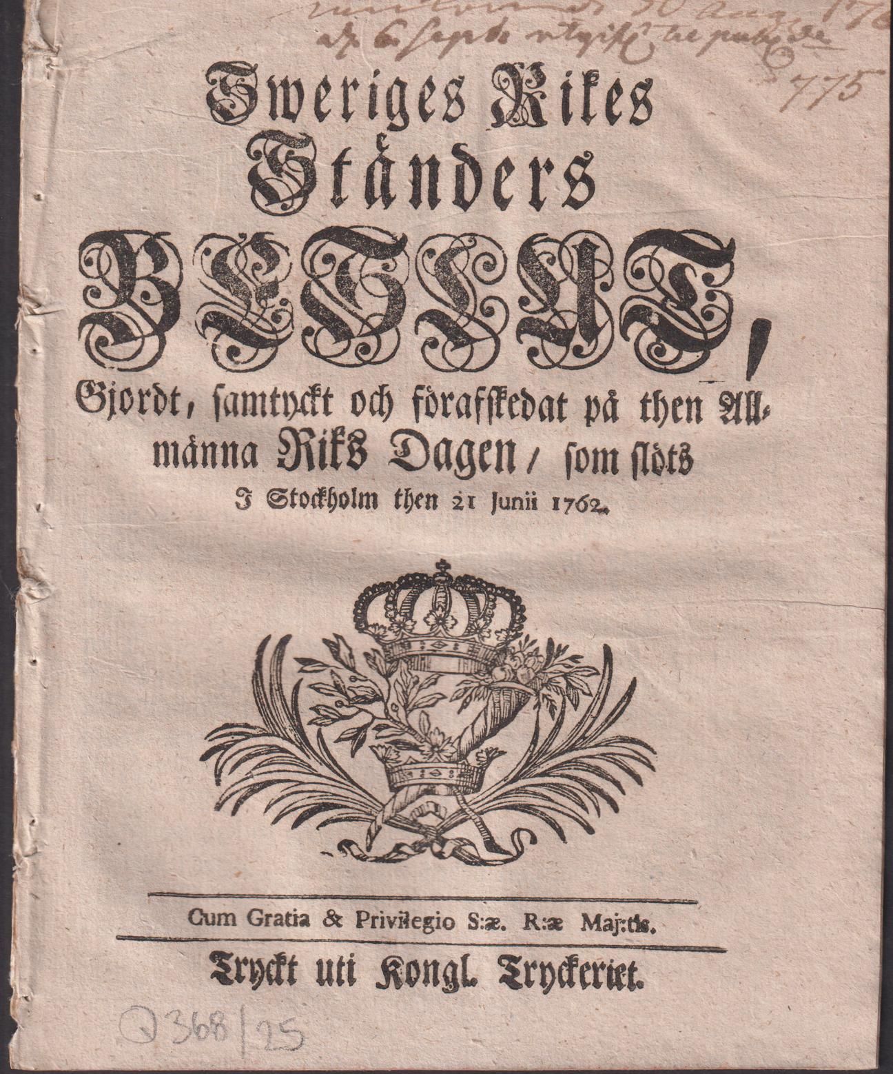 Sweriges rikes ständers beslut, gjordt, samtyckt och förafskedat på then allmänna riks dagen, som slöts i Stockholm then 21 junii 1762.
