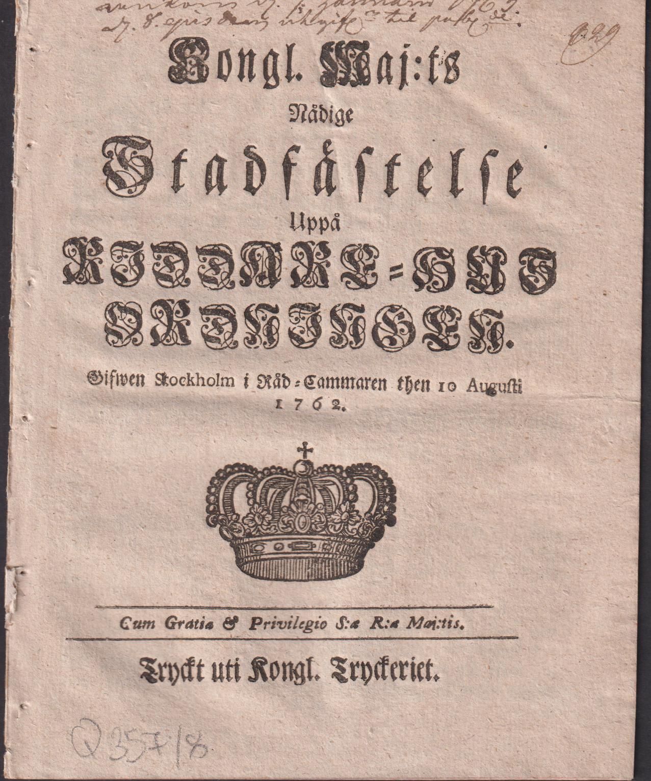 Kongl. Maj:ts Nådige Stadfästelse Uppå Riddare-Hus Ordningen. Gifwen Stockholm i Råd-Cammaren then 10 Augusti 1762.