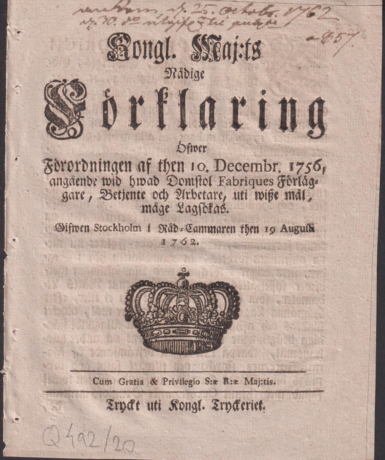Kongl. Maj:ts Nådige Förklaring Öfwer Förordningen af then 10. Decembr. 1756, angående wid hwad Domstol Fabriques Förläggare, Betjente och Arbetare, uti wisse mål, måge Lagsökas. Gifwen Stockholm i Råd-Cammaren then 19 Augusti 1762.