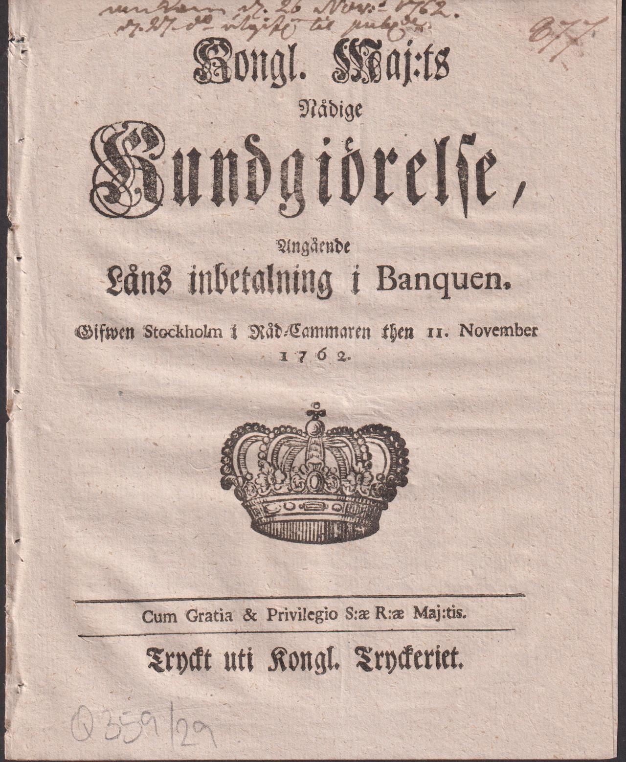 Kongl. Maj:ts Nådige Kundgiörelse, Angående Låns inbetalning i Banquen. Gifwen Stockholm i Råd-Cammaren then 11. November 1762.