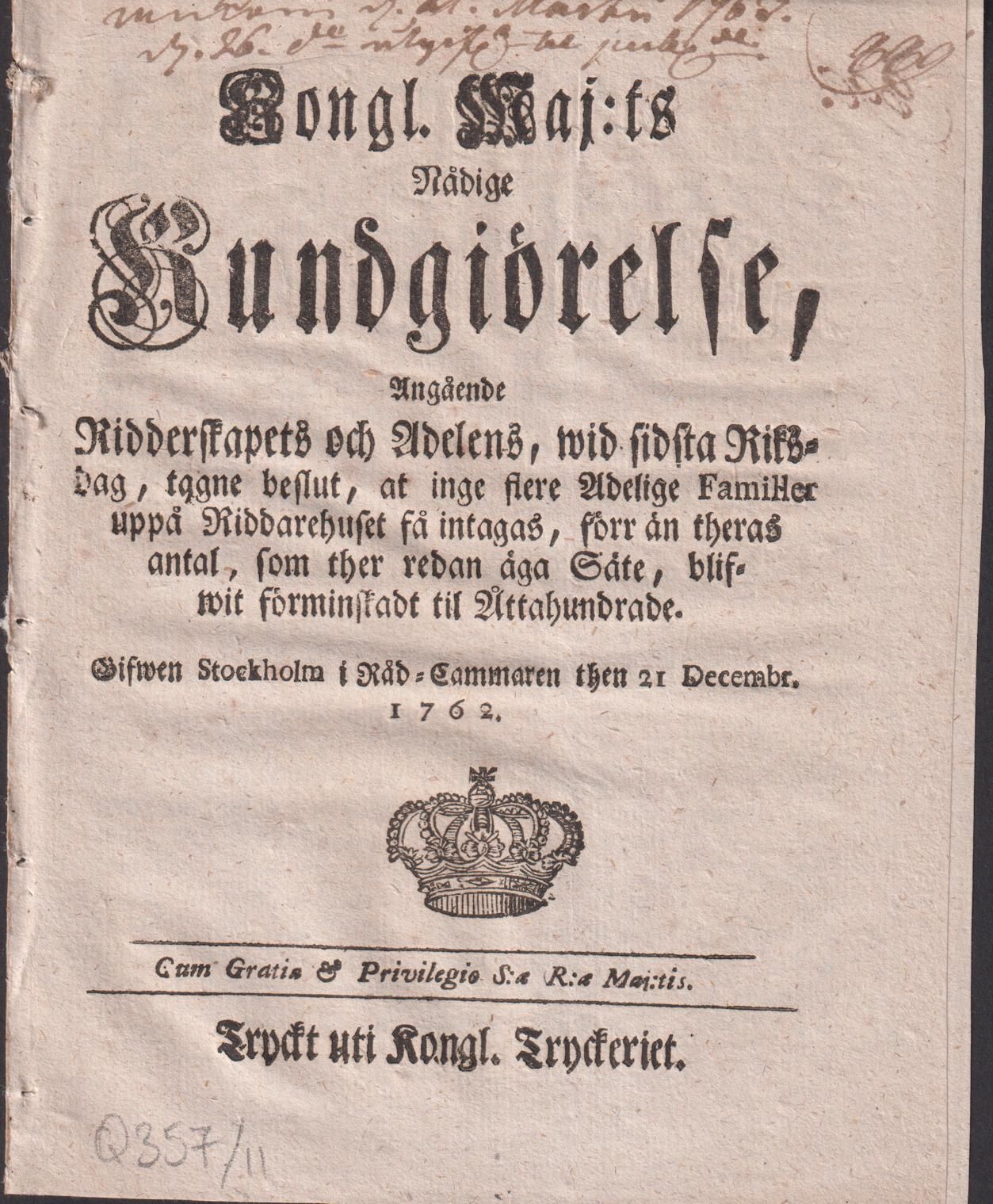 Kongl. Maj:ts Nådige Kundgiörelse, Angående Ridderskapets och Adelens, wid sidsta Riksdag, tagne beslut, at inge flere Adelige Familler uppå Riddarehuset få intagas, förr än theras antal, som ther redan äga Säte, blifwit förminskadt til Åttahundrade. Gifwen Stockholm i Råd-Cammaren then 21 Decembr. 1762.