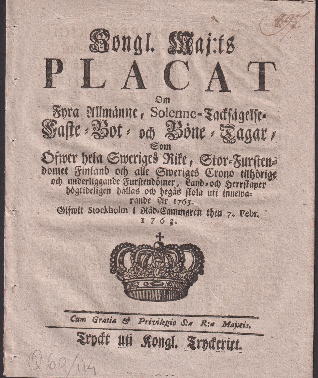 Kongl. maj:ts Placat Om Fyra Allmänne, Solenne Tacksägelse- Faste- Bot- och Böne-Dagar, Som Öfwer hela Sweriges Rike, Stor-Furstendömet Finland och alle Sweriges Crono tilhörige och underliggande Furstendömer, Land- och Herrskaper högtideligen hållas och begås skola uti innewarande År 1763. Gifwit Stockholm i Råd-Cammaren then 7. februarii 1763.