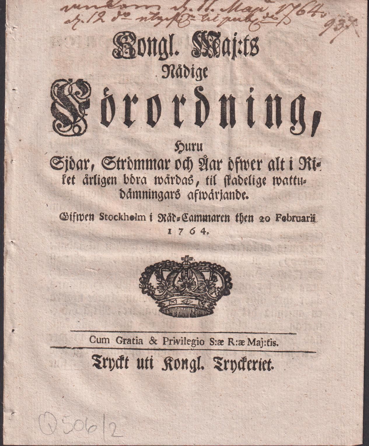 Kongl. maj:ts nådige Förordning, Huru Sjöar, Strömmar och Åar öfwer alt i Riket årligen böra wårdas, til skadelige wattudämningars afwärjande. Gifwen Stockholm i Råd-Cammaren then 20 februarii 1764.
