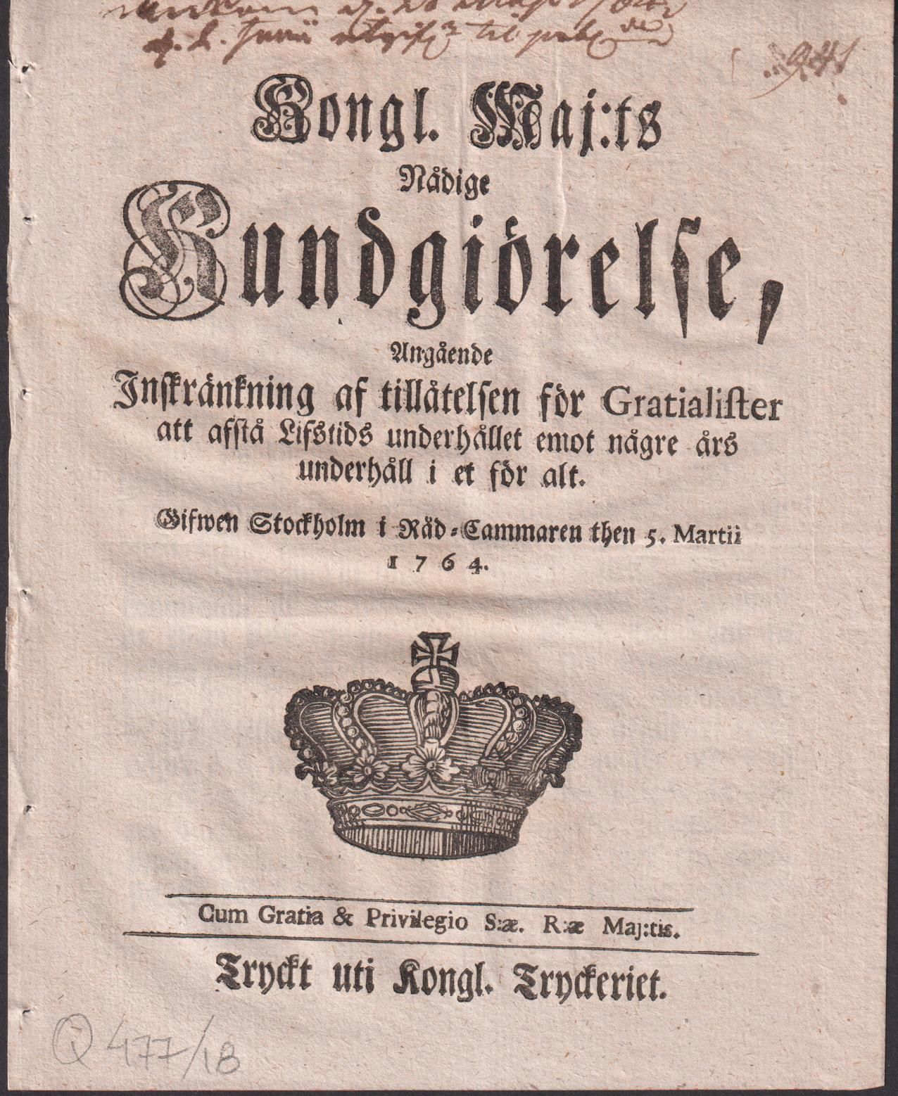 Kongl. maj:ts nådige Kundgiörelse, Angående Inskränkning af tillåtelsen för Gratialister att afstå Lifstids underhållet emot någre års underhåll i et för alt. Gifwen Stockholm i Råd-Cammaren then 5. martii 1764.